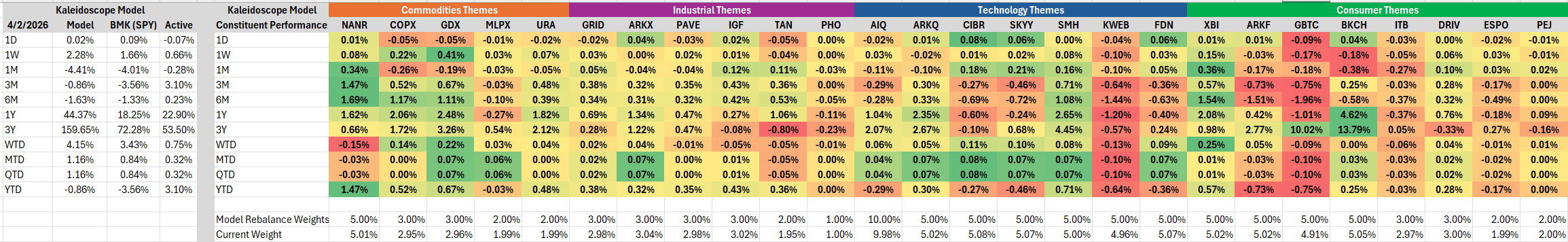 The Kaleidoscope Thematic Equity Model delivered +2.28% over the trailing week, outpacing the SPY benchmark’s +1.66% by 66 basis points. Over the trailing month, the model declined -4.41% versus -4.01% for SPY, a modest -28 bps of underperformance in a broadly difficult tape. Year-to-date, the model has held up meaningfully better, posting -0.86% against SPY’s -3.56%, representing +310 bps of active outperformance.