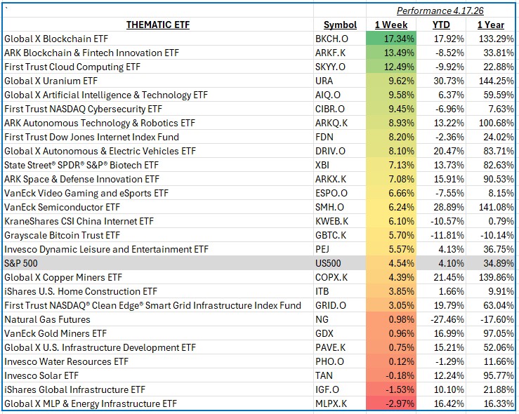 The S&P 500 advanced 4.54% for the week ending April 17, 2026, as risk appetite returned across equity markets, particularly within thematic and innovation-driven segments. Key highlights for the week included a renewed rally in digital assets, which lifted blockchain-related equities, moderating interest rate expectations that supported long-duration growth themes, and continued strength in artificial intelligence and cloud adoption. Together, these factors drove strong performance across high-beta, future-oriented investment themes.